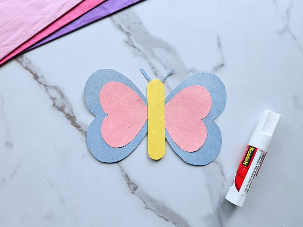Use some of your scrap paper to make two antennae for you butterfly and glue them to the back of the head.