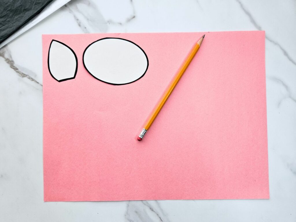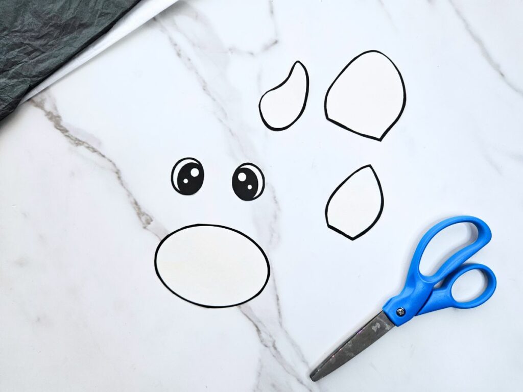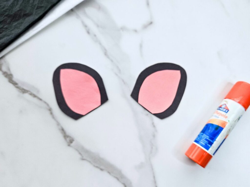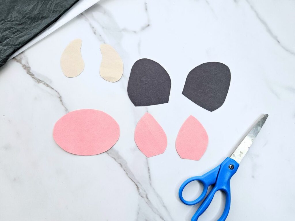 - Trace the inner ear and nose pieces onto pink paper, trace the horns onto tan or brown paper, and trace the outer ear onto black paper. Cut out the traced pieces.