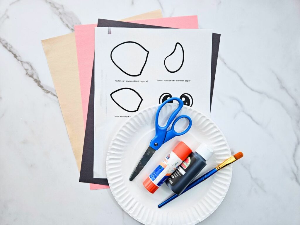 Trace the pieces of the template onto colored paper. Trace the nose and inside of the ears onto pink paper, the outer ears onto black paper, and the horns onto tan or brown paper.