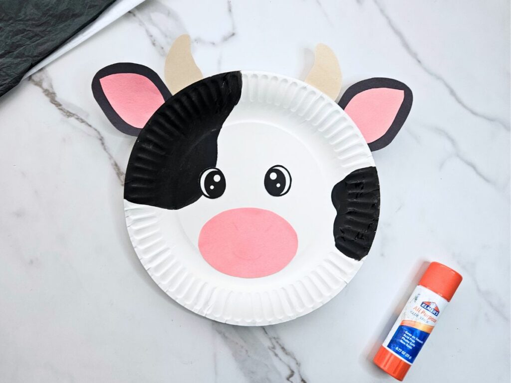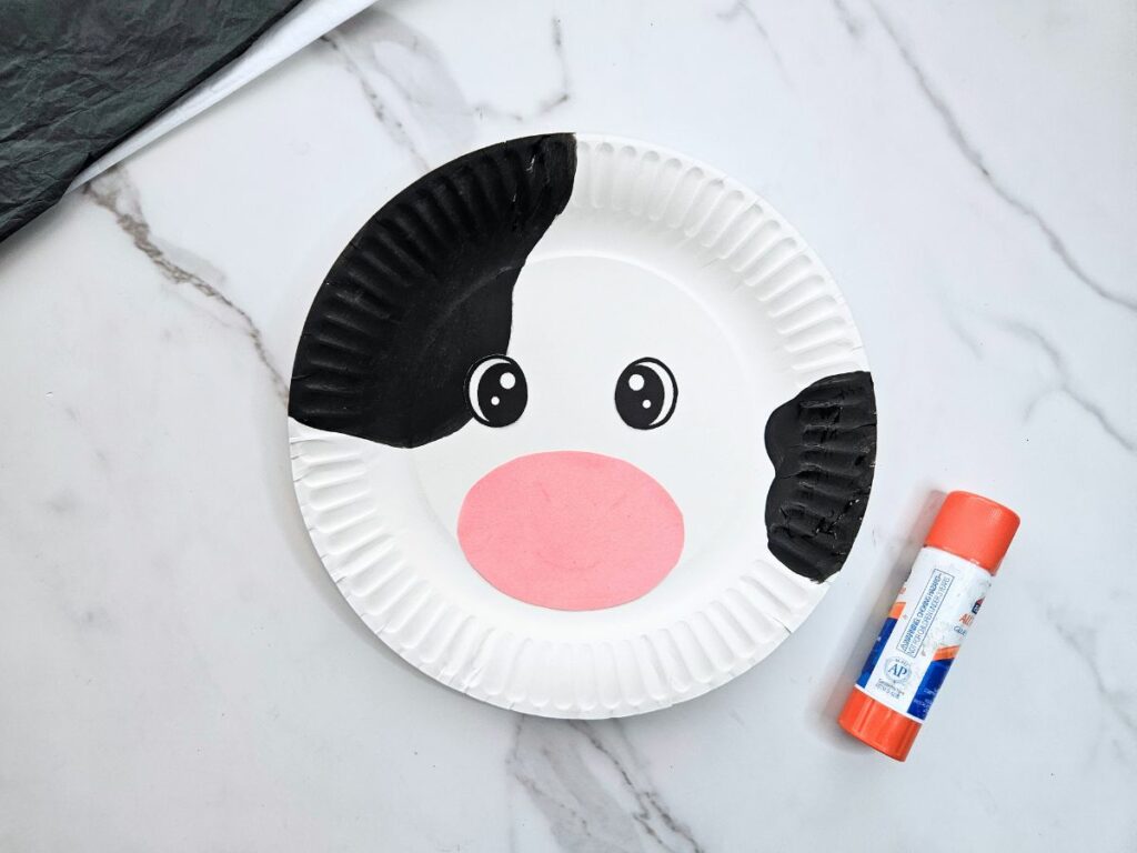 First, glue the eyes and nose onto the cow’s face.