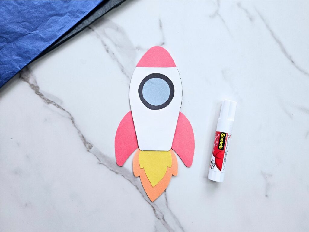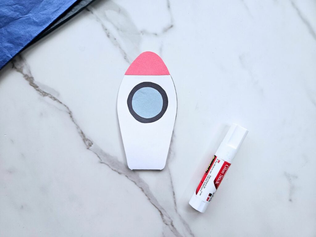 - Glue the large circle onto the center of the rocket, then glue the smaller circle onto the larger circle.