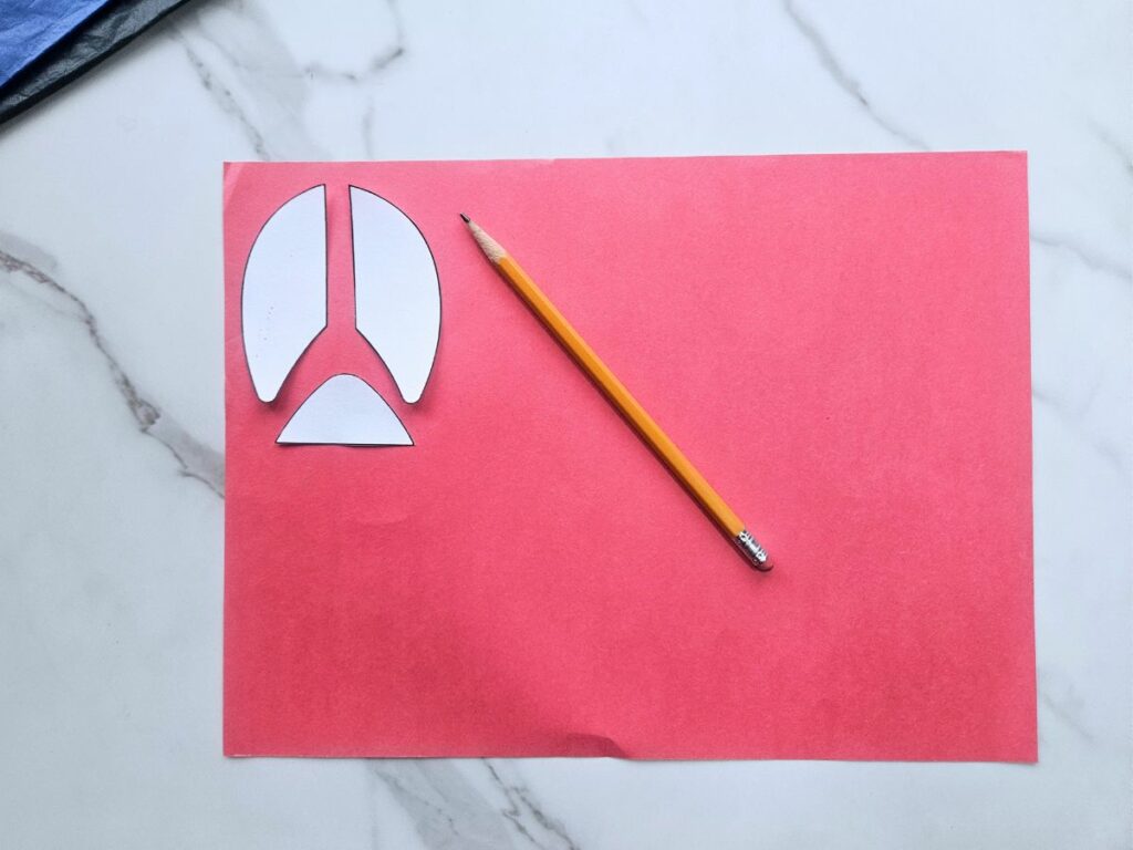 Now trace the pieces of the template onto colored paper. Trace the nose and blasters onto red paper, trace the larger circle onto black paper, and trace the smaller circle onto light blue paper. Then trace the larger flame onto orange paper and the smaller flame onto yellow paper.