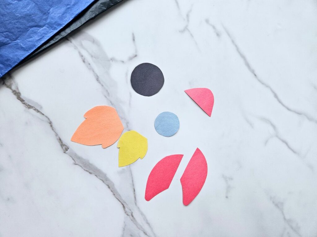 - Trace and cut out the pieces of the template onto colored paper. Trace the nose and blasters onto red paper, the larger circle onto black paper, the smaller circle onto light blue paper, the larger flame onto orange paper, and the smaller flame onto yellow paper.