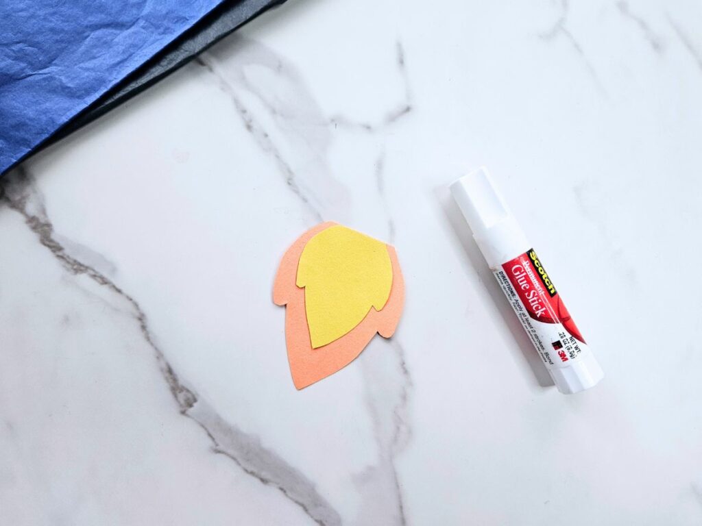 - Glue the smaller flame onto the larger flame, then glue the top of the flames to the bottom of the rocket on the back.