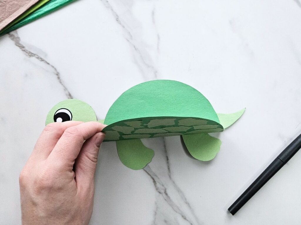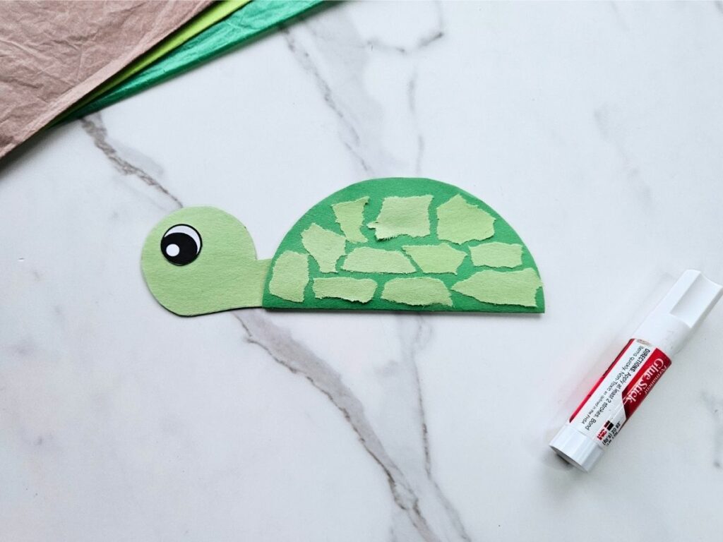 Glue the turtle’s eye onto the head, then glue the base of the head onto the back of the shell.