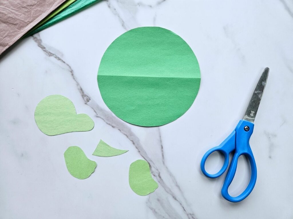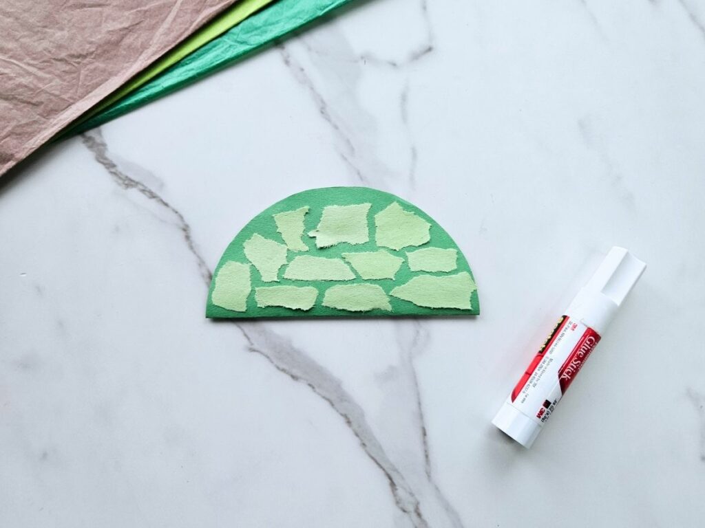 Fold the round shell in half. To make the textured pattern on the shell, tear small pieces of light green paper and glue them to the shell, leaving a small gap in between the pieces.
